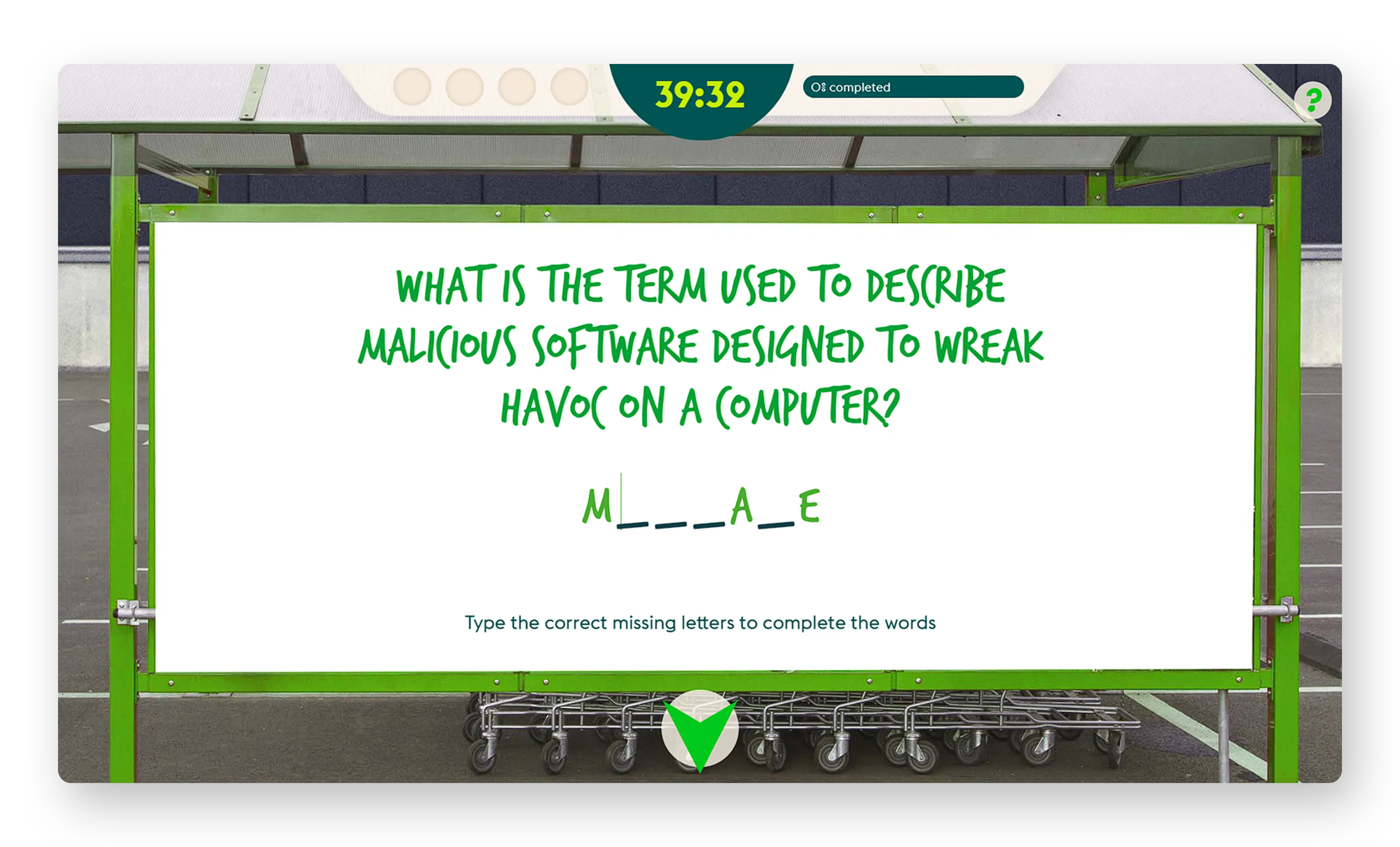 - Fill-in-the-blanks puzzle: players complete cyber security-related terms by filling in the blank letters of incomplete words.